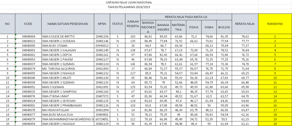 Berikut adalah daftar 20 SMA terbaik di Sleman berdasarkan rata-rata nilai Ujian Nasional 2018/2019: